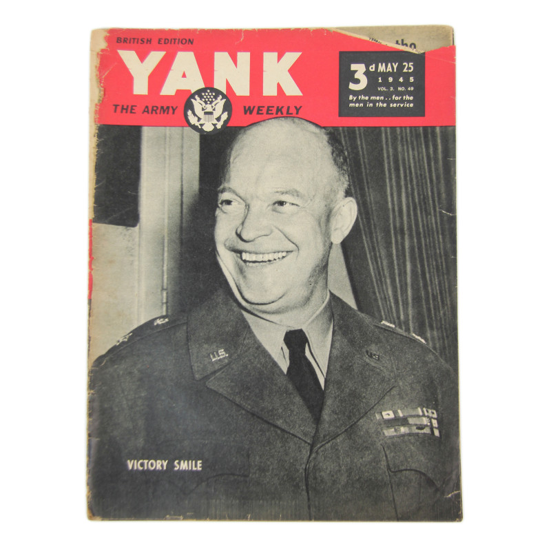 YANK magazine, British edition, May 25, 1945 issue, on the front cover of which appears a portrait of General Dwight D. Eisenhower with a broad smile, taken on the occasion of the German surrender in Reims, France on May 7.