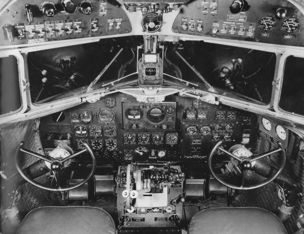 Rare genuine WWII USAAF C-47 Skytrain steering wheel, mounted on a base for decorative purposes.
