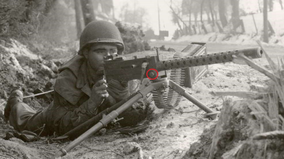 Genuine WWII steel pintle screw for the Browning machine gun, cal .30, M1919. This specific part is holding the gun to the pintle, allowing it to be mounted on the tripod.