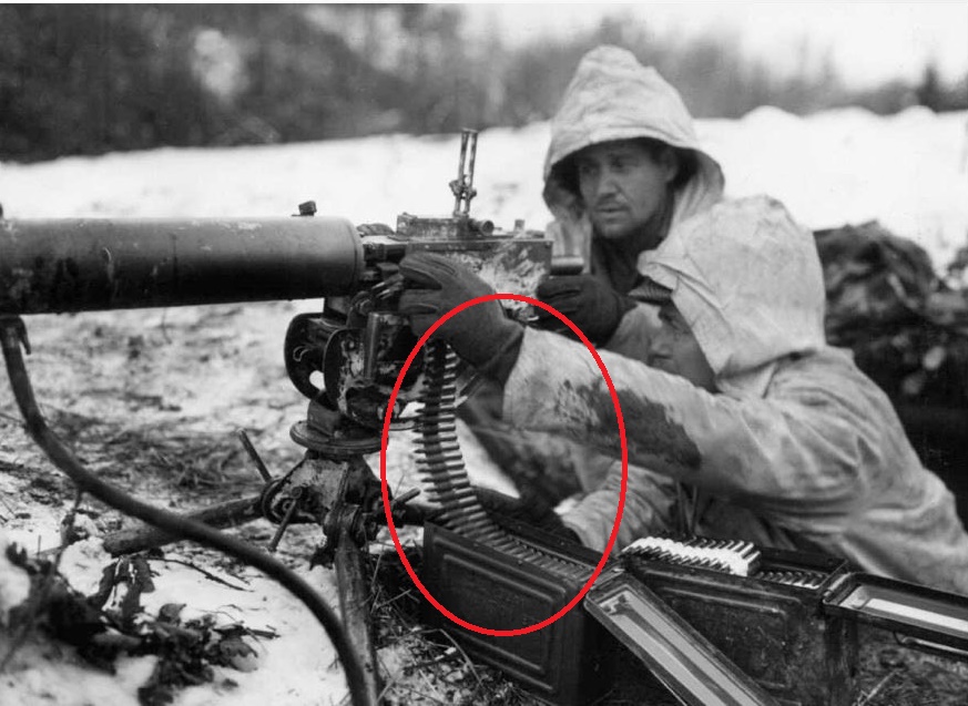 Bande en toile de coton blanche, d'origine Seconde Guerre mondiale, d'une capacité de 250 cartouches de calibre .30 destinées à la mitrailleuse Browning M1919A4.