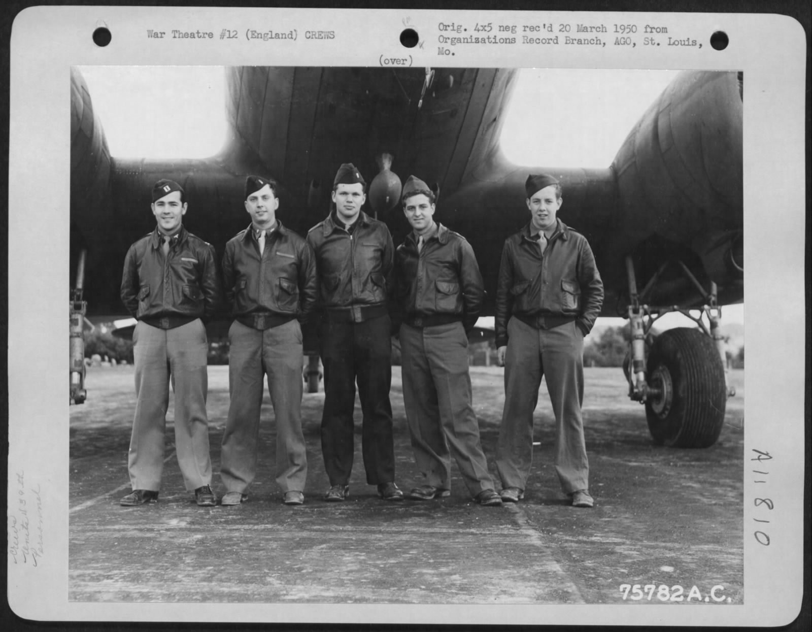 Équipage du C-47 Skytrain #43-15649 le 6 juin 1944. De gauche à droite : Cpt. Thomas L. Morris (pilote), 2nd Lt. Arthur E. Luciani (copilote), 2nd Lt. Jack Hindus (navigateur), S/Sgt. Percy Walter (chef) et Sgt. Gordon D. Solie (radio/mécanicien).