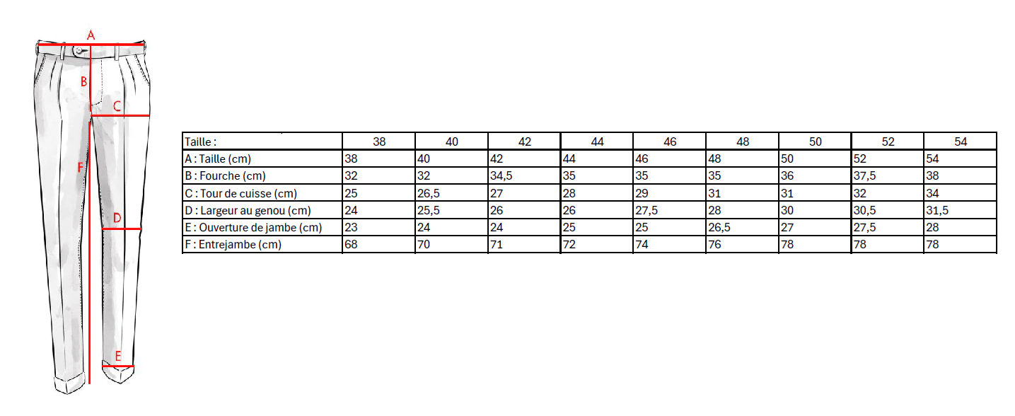 Attention : ces pantalons taillent comme les modèles d’époque. Ils sont à taille haute, la mesure doit donc être prise au niveau du nombril. Les cuisses sont plus étroites que les modèles fin de guerre. Référez-vous au tableau ci-dessous en description :