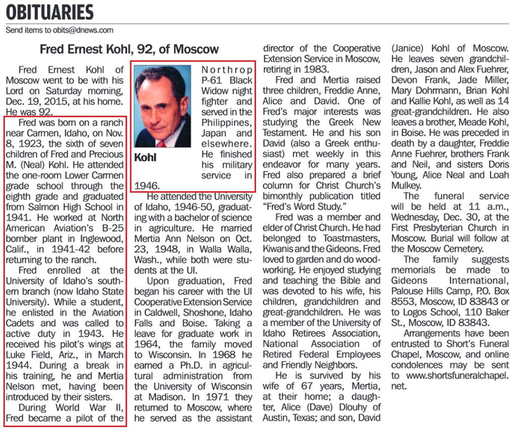 Fred Ernest Kohl est né le 8 novembre 1923 à Carmen (Idaho) et rejoint l'Air Corps le 12 décembre 1942. Breveté pilote en tant que 2nd Lieutenant le 12 mars 1944, il sera déployé dans le Pacifique avec le 421st Night Fighter Squadron en octobre suivant, participant notamment aux opérations en Nouvelle-Guinée et aux Philippines aux commandes d'un chasseur de nuit P-61 Black Widow. Rapatrié le 2 février 1946 et démobilisé le 31 mars avec le grade de 1st Lieutenant, il est décédé le 19 décembre 2015.