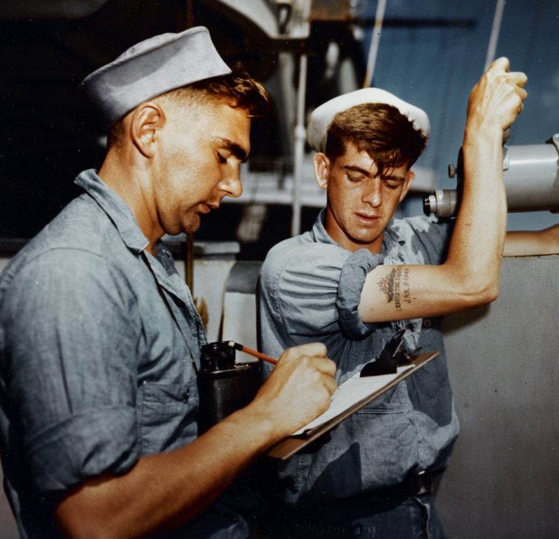 Chemise chambray, bleue, à manches longues, US Navy, 14 ½, 1944, nominative